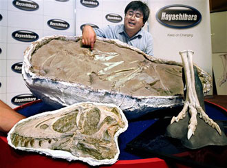 Researcher Mahito Watabe of Hayashibara Museum of Natural Sciences (HMNS) shows Wednesday, July 23, 2008 in Okayama, western Japan, the fossilized skull, foreground left, the left hind leg, foreground right, of a skeleton of 70-million-year-old young dinosaur Tarbosaurus that was uncovered in the Gobi Desert in Mongolia in August, 2006. The shown together is a reproduction model of a chunk of sandstone with the complete skeleton of the Tarbosaurus — related to the giant carnivorous Tyrannosaurus — that shows how it looked when it was uncovered by scientists from Japan's HMNS, including Watabe, and the Mongolian Academy of Sciences.