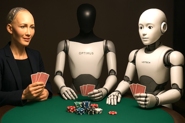Tesla's Optimus, Boston Dynamics' Digit, and UBTech's Walker S2 play poker in this illustration by Gemini.