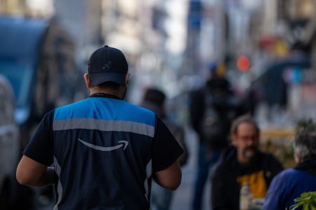 An Amazon employee delivers packages in downtown San Francisco, California, U.S., January 26, 2026. REUTERS/Carlos Barria
