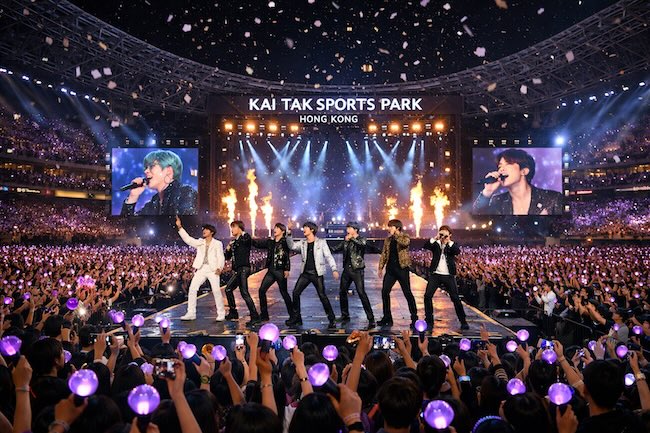 Artist's conception of BTS performing at the Kai Tak Sports Park in Hong Kong. (Image by ChatGPT)