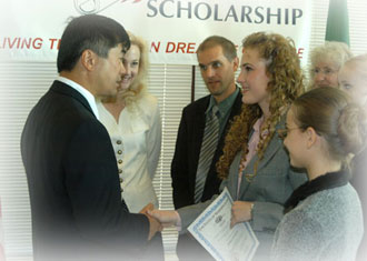 Gary Locke awards Ashley Cochrane a Promise Scholarship at a student leadership conference at Gonzaga University in September 2003.