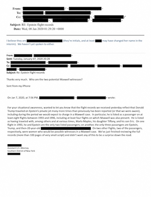 On one flight, the only three passengers were Epstein, Trump and a 20-year-old woman whose name was redacted. "On two other flights, two of the passengers, respectively, were women who would be possible witnesses in a Maxwell case," the document stated.