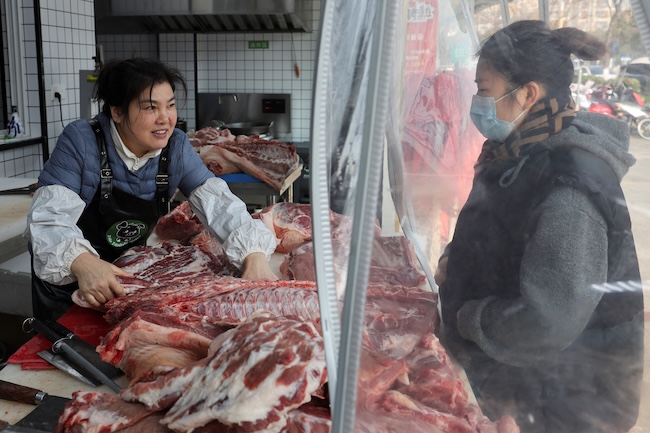 An employee serves a customer shopping for pork at a black pork shop in Taizhou, Jiangsu province, China January 16, 2026. REUTERS/Go Nakamura