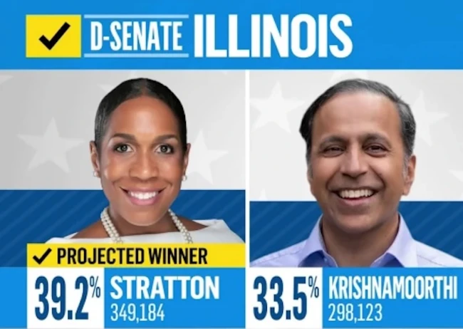 Once widely considered the frontrunner, IL Rep. Raja Krishnamorthi, an Indian American, lost to Lt. Governor Juliana Stratton on Tuesday.