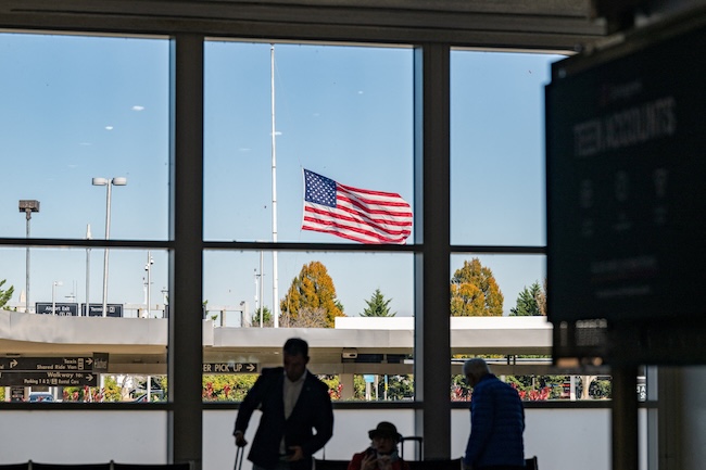 A U.S flag flies outside as passengers wait at Ronald Reagan Washington National Airport, more than a month into the ongoing U.S. government shutdown, in Arlington, Virginia, U.S., November 11, 2025. REUTERS/Annabelle Gordon
