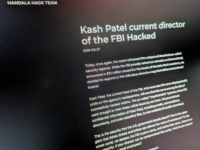 The website used by the Handala Hack Team, an Iran-linked hacker group which has claimed credit for the breach of FBI Director Kash Patel’s personal email, is shown on a screen in Washington D.C., U.S., March 27, 2026. REUTERS/Raphael Satter