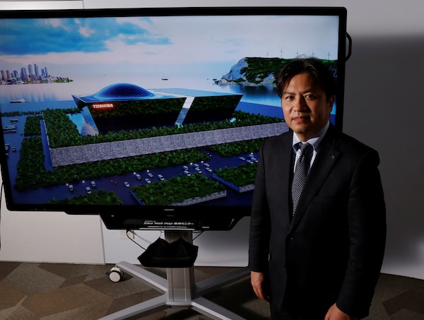 Nuclear industry engineer Keiji Matsunaga poses for a photo next an image of Toshiba’s next-generation reactor during an interview with Reuters in Kawasaki, Japan, February 27, 2026. REUTERS/Manami Yamada