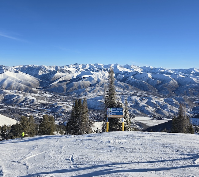 The top of Lookout Express offered a gloriously sunny 360-degree panorama that included the western view. The main blue run down the front of Bald Mountain had been pretty well scraped down to a skid-inducing hardness by the earlybird crowd, making for tricky skiing on par with a black diamond run. The runs to the front left and to the far right — avoiding the near right black diamond runs — were gentler with better snow.